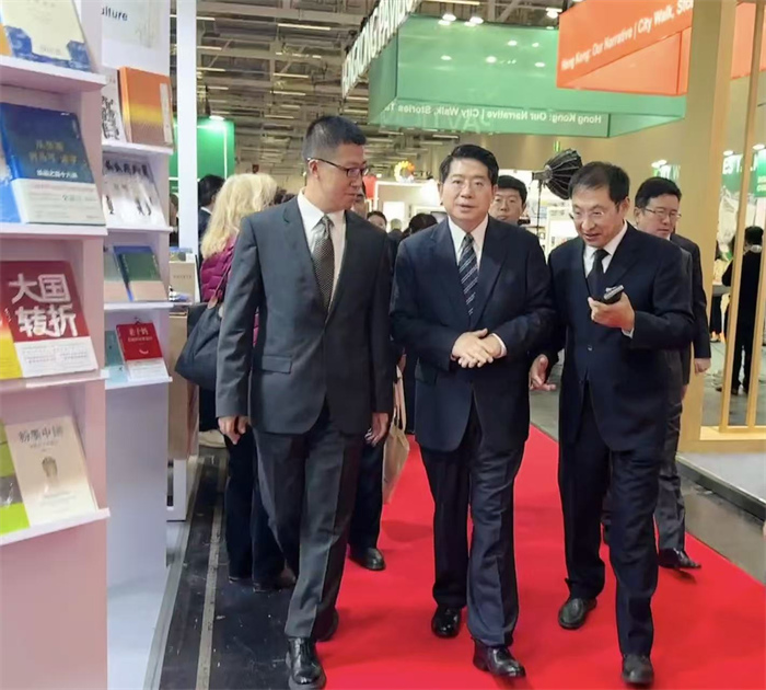 第77届法兰克福书展首日,中国驻德国大使邓洪波亲临国图集团展台巡展,了解中国出版物版权交流情况,并与参展出版机构代表进行交流。中国出版界代表团团长、国图集团副总经理高晓强陪同巡展。