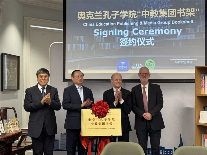 出访新西兰期间,代表团成员单位中国教育出版传媒集团与奥克兰孔子学院“中教集团书架”签约仪式举行,这标志着“中教集团书架”正式落地奥克兰孔子学院,新华社对其进行了专题报道,并被中国日报等数家媒体转载。中国驻奥克兰总领事陈世杰、中国教育出版传媒集团董事长冯云生、奥克兰孔子学院理事会成员康浩、奥克兰大学出版社社长马尔科姆·坎贝尔等中新嘉宾出席活动。近年来,随着国际文化交流的不断丰富,中文已成为新西兰发展最快的外语之一。“中教集团书架”的设立,旨在通过免费提供中文图书资源、设立专属阅读区域、组织系列文化交流活动,打造兼具中文学习与中国文化传播功能的示范平台。