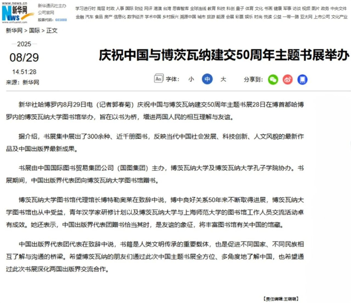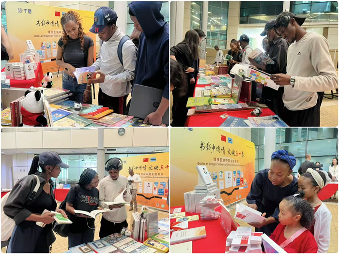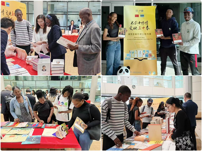 当地时间8月28日,庆祝中国与博茨瓦纳建交50周年主题书展在博首都哈博罗内的博茨瓦纳大学图书馆举办,旨在以书为桥,增进两国人民的相互理解与友谊。