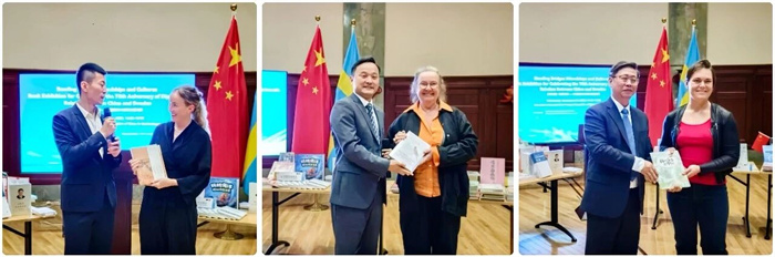 中国出版界代表团向瑞方出版机构介绍传统文化、科技、教育、人文、历史、社科、海洋科学、中医药等领域的优秀图书并现场赠书。杨培栋向杨富雷赠送《大中华文库》,向瑞典出版机构代表赠送《中华文化之美》系列图书。