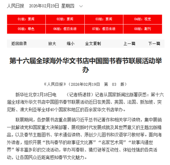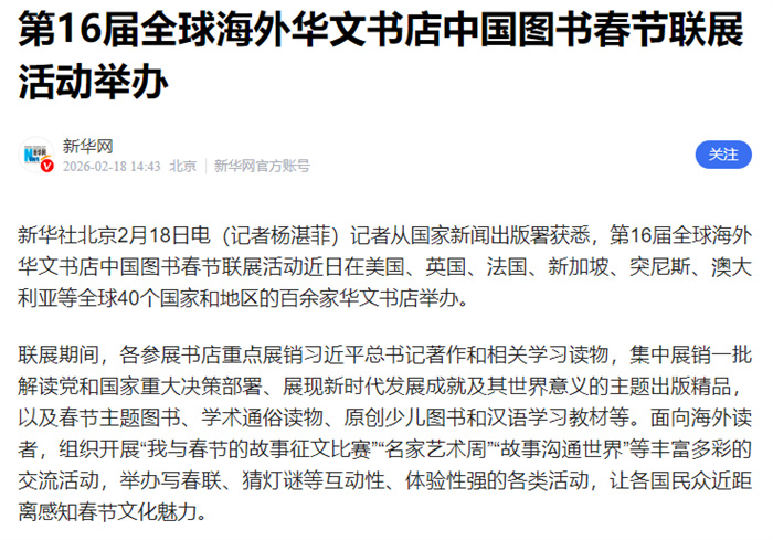 第十六届全球海外华文书店中国图书春节联展活动近日在全球40个国家和地区的百余家华文书店举办。作为主要承办单位,中国国际图书贸易集团有限公司(简称国图集团)组织美国、英国、法国、毛里求斯、南非、委内瑞拉等25个国家和地区的47家实体书店同步开展活动。